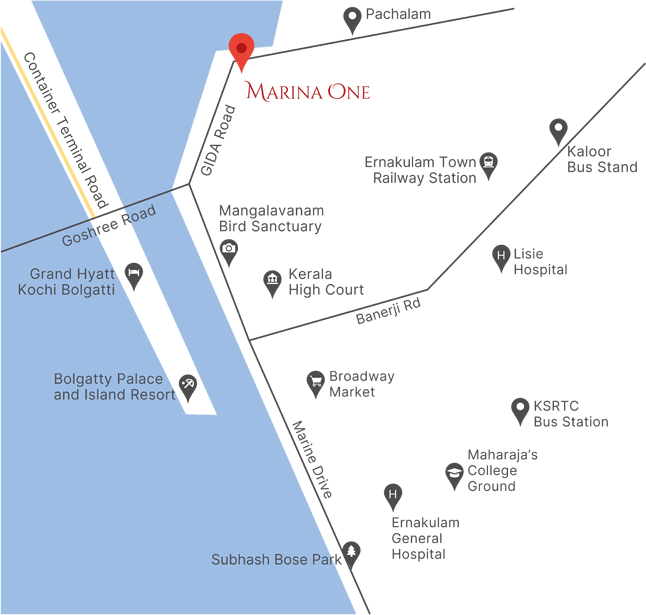 landscaped parks/ walking zones/ kid's play areas/ community spaces/ 46000 sq. ft clubhouse below the park filled with sports & lifestyle spaces such as badminton courts, gym, spa & sauna, convenience store & much more that ensures the spirit of Kerala comes alive at Marina One.